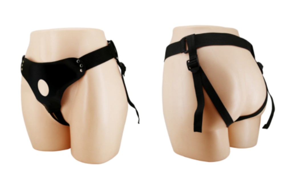 Tem uma área frontal para fixar a ventosa do dildo penetrador. E ajustes na cintura com circunferência de até 90cm.